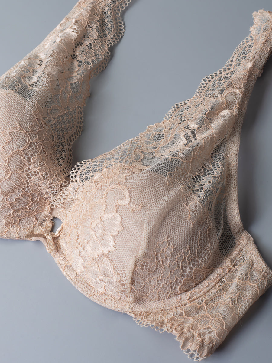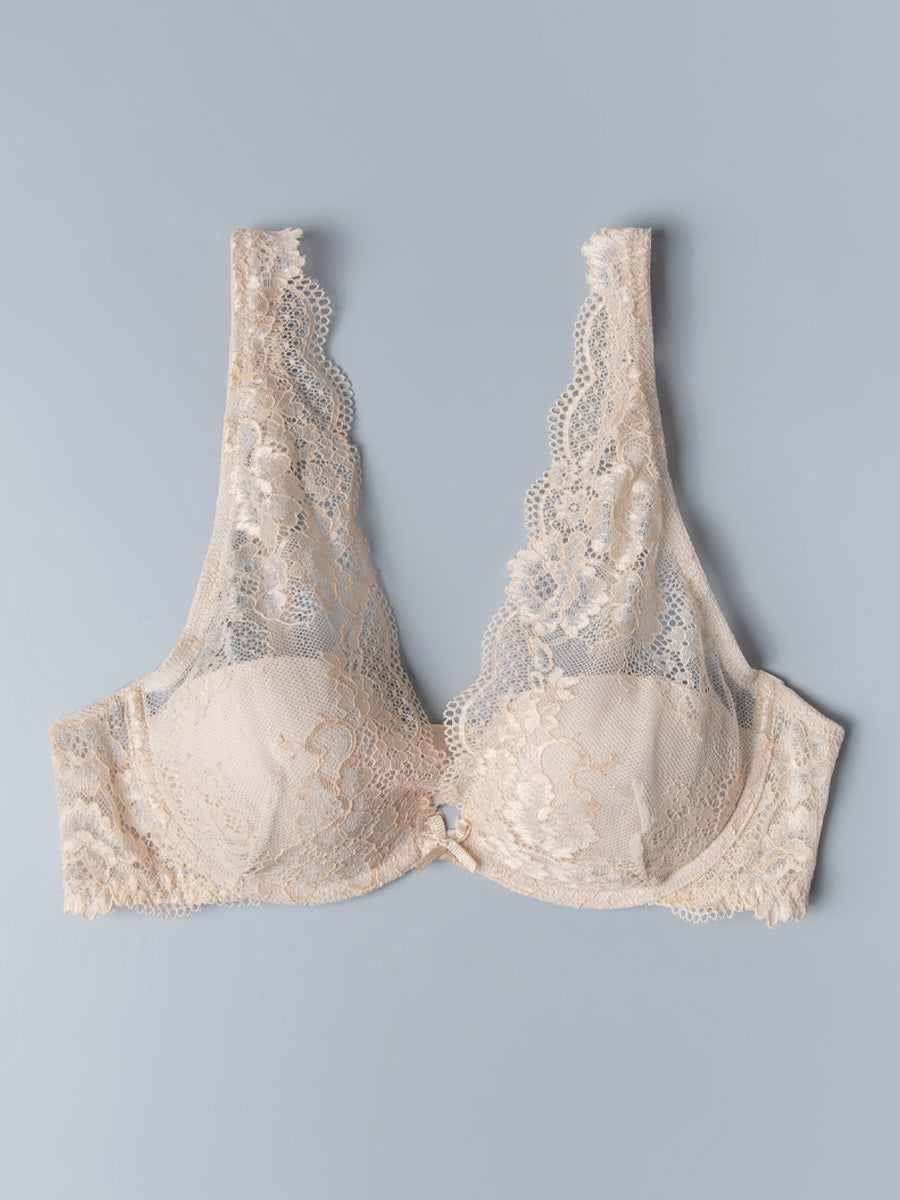 Di assoluta tendenza bralette con ferretto e coppe imbottite, interamente realizzata in soffice pizzo dal prezioso motivo floreale.