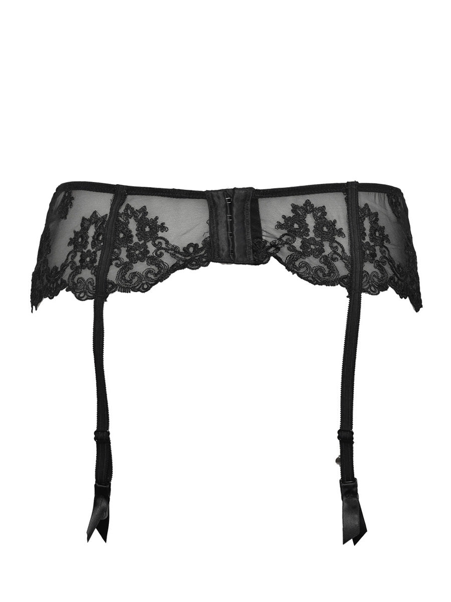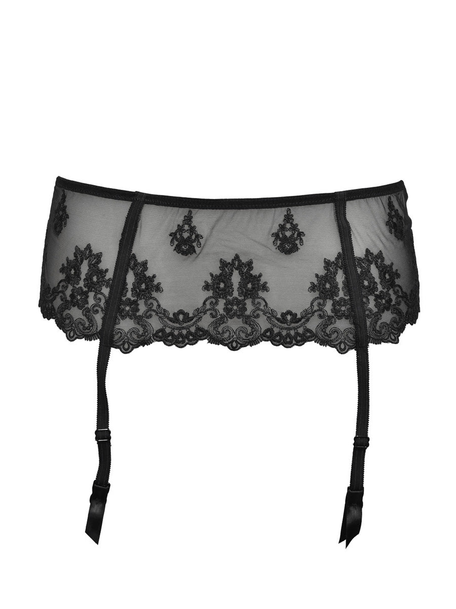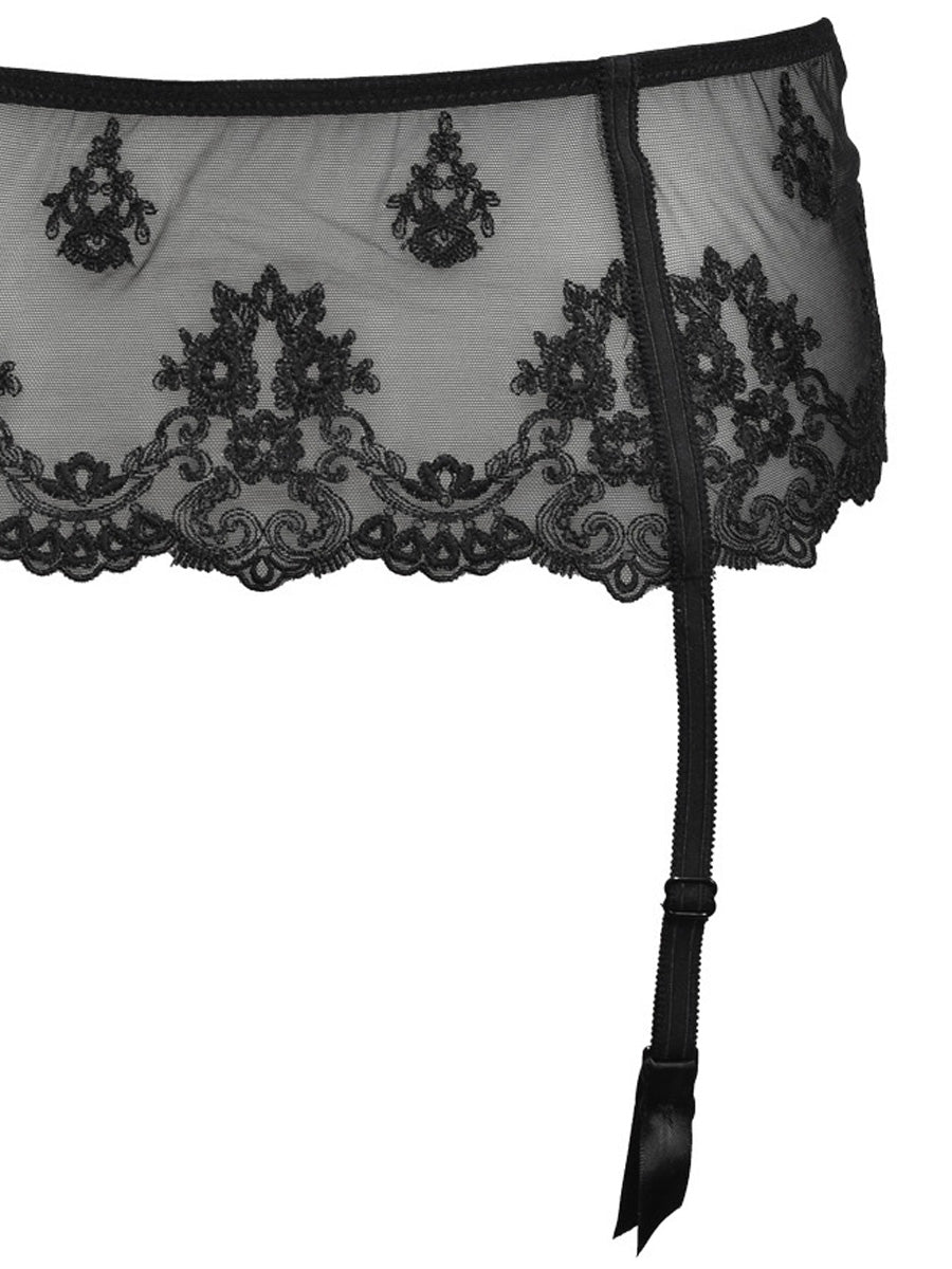Il gioco di trasparenze del tulle ricamato conferisce a questo reggicalze un sapore squisitamente retrò. Pensato e realizzato ad hoc per accompagnare ed esaltare le forme femminili.