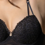 Il reggiseno Beloved offre sostegno e comfort senza rinunciare all’eleganza. Realizzato in pizzo con micropois laminato argento e tulle elasticizzato tinta unita, valorizza il décolleté con stile femminile e raffinato.